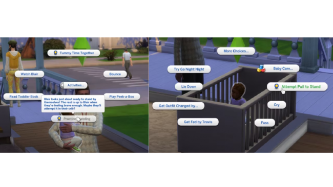- Мы исправили ошибку, из-за которой симам было сложно достичь рубежа «Подъем с подтягиванием». Проблема заключается в том, что для подъема в первый раз младенцы должны находиться около определенных предметов, но это нигде не указано, а младенцы далеко не всегда находятся около данных предметов. Они могут достичь этого рубежа как и прежде, но чтобы внести больше ясности, мы добавили в игру неактивное действие и подсказку, в которой говорится, что игрокам следует поместить младенца в колыбель. Находясь в колыбели, младенцы смогут подтянуться и встать автономно. Кроме того, мы добавили новое действие для младенцев, благодаря которому они смогут подняться по желанию, когда будут готовы к достижению рубежа. Эти действие доступно активным младенцам.