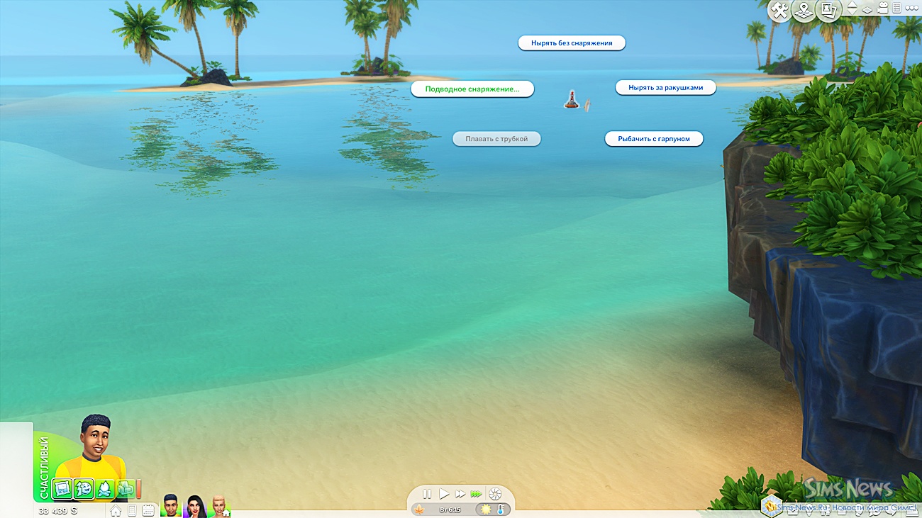 На глубоководном буе можно приобрести гарпун за 500§ (требуется 4 уровень навыка фитнеса) через опцию «Подводное снаряжение». После покупки сим наденет водолазный костюм и нырнет на глубину. Процесс занимает около часа, после чего приходит уведомление о результатах.