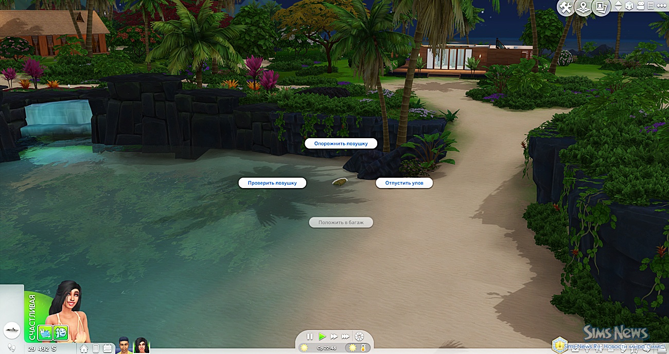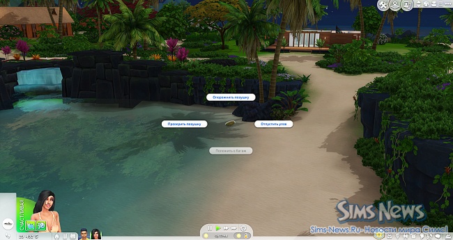- Отпустить рыбу — сим получает мудлет «Друг рыб» (+2 счастья на 2 часа) и повышает репутацию (требуется дополнение «Путь к славе»).