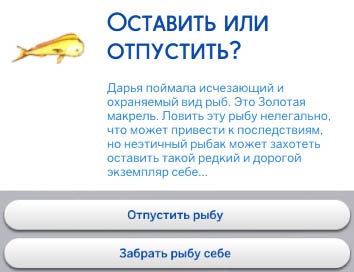 Во время рыбалки персонаж иногда будет получать уведомление о поимке исчезающего вида рыбы. У вас есть два варианта действий: