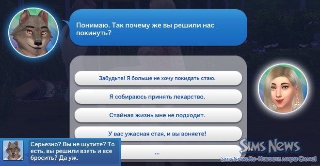 Каждый вариант вашего ответа имеет свои последствия: некоторые сопровождаются прощальными подарками, такими как луноцвет или волчий корень, а в некоторых случаях можно потерять статус друга стаи. Например, если выбрать неожиданный или резкий вариант ответа, стая может расценить это как нарушение доверия и лишить вас привилегий.В Клыках, например, Рори отреагирует строго: она выслушает, но покажет, что решение покинуть стаю не проходит без последствий для отношений.