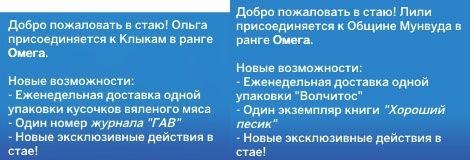 | Бонусы после вступления | • Еженедельная доставка упаковки «Волчитос» • Книга «Хороший песик» • Эксклюзивные действия стаи | • Еженедельная доставка кусочков вяленого мяса • Журнал «ГАВ» • Эксклюзивные действия стаи |