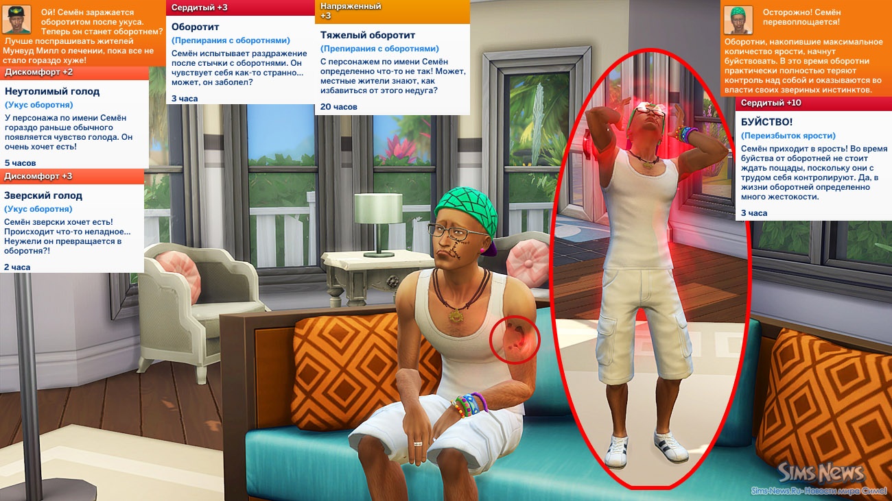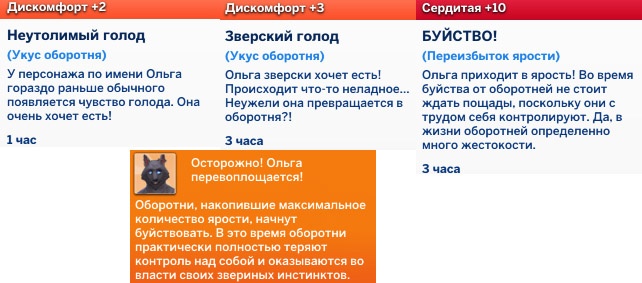 Обращение не происходит мгновенно. Это постепенный процесс примерно на полтора игровых дня. Сим проходит через серию неприятных состояний: напряжение, дискомфорт, ярость.На руке появляется заметная метка укуса, которая начинает пульсировать красным и по мере приближения трансформации становится ярче. На финальной стадии появляется мудлет «Зверский голод», шкала голода падает стремительно. Если не следить за персонажем, он может буквально умереть от голода до обращения.